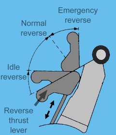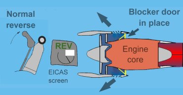To select reverse thrust there must first be weight on the wheels. This is sensed through ‘squat switches’ on the main undercarriage. Secondly, the thrust lever must be in the ‘idle’ position. Only when these two pre-requisites are satisfied will an isolation valve open to permit reverse thrust activation.