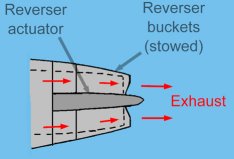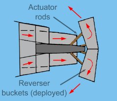 Bucket type: This is also known as ‘target type’, and is hydraulically actuated. In the forward thrust position the thrust reverser buckets form the convergent/divergent exhaust nozzle of the engine. In the reverse position the buckets deflect the hot exhaust gasses forward (refer fig’s BGT 3a and 3b).