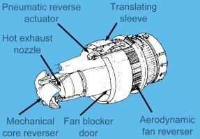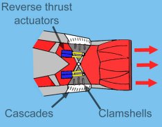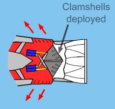 The clamshell doors form part of the exhaust tailpipe when in the forward thrust position. When reverse thrust is selected, the pneumatic actuators move the clamshell doors so as to block the escape of exhaust gases, and deflect them forward through forward angled ‘cascade vanes’. These are only exposed when the clamshell doors move toward the reverse thrust position. Like the bucket type, the clamshells operate in the very hot and high velocity exhaust gas stream, and so must be built of very sturdy heat resistant metal alloys.