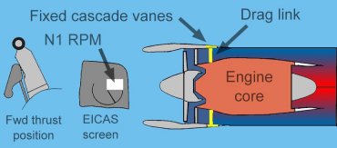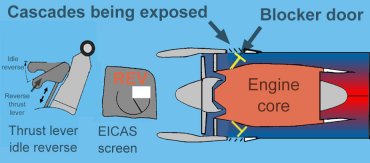 Fig’s 6a, 6b, and 6c show the progression from forward to reverse thrust on a General Electric CF6 engine as fitted to a Boeing B767. Note the EICAS annunciations when blocker doors are in transit, and when locked in reverse thrust position.