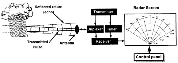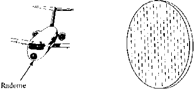 Weather radar is a type primary radar, and relies on reflection of pulsed radar (microwave) energy off large water droplets, or water covered hail. Conventional types do NOT detect turbulence, though more modern Doppler types can. In conventional types, turbulence is linked with the size of water droplets. Large droplets reflect a large amount of the transmitted microwave energy, and returns from such areas are assumed to be turbulent through “guilt by association”. Weather radar emits a conical beam, the width of which is called the “beamwidth”. Beam widths vary from antenna to antenna, but are typically in the order of 3-5 degrees wide. As the microwave energy leaves the antenna, it is only several centimetres across, but by the time a 5 degree beamwidth reaches 60 nm ahead of the aircraft it is 5 nm across, and 10 nm across at a range of 120 nm. The energy loss with distance from the antenna is called distance attenuation (weakening). Returns from distant targets will NOT have the same degree of resolution (detail) as would a target closer to the aircraft. Appreciation of storm turbulence severity is NOT as good at ranges over about 60 nm. Most of the transmitted energy that encounters a rain bearing cloud will NOT return to the aircraft, but will be either absorbed or refracted (scattered) in various directions. The energy that is recieved back at the aircraft will need to be amplified for interpretation and display on the radar screen in the cockpit. There are two weather radar frequency bands, namely “C band” (4000 - 8000 MHz), and “X band” (8000 - 12500 MHz). C band illuminates storms beyond nearby precipitation better, but does not provide the resolution of X band. The higher X band frequencies are more susceptible to signal absorption, and scattering from smaller raindrops. Weather radar components ( refer fig’s Wx radar 1 & 2) The antenna: This can either be of “Parabolic dish type”, or “Flat plate type”, mounted in the nose of the aircraft. The flat plate type is the more modern, and has the advantage of reducing power input requirements because it wastes less energy as sidelobes. Both antenna types act in the dual role of transmitters and receivers of pulsed energy.